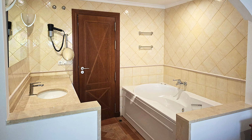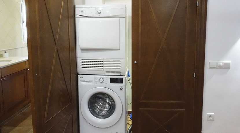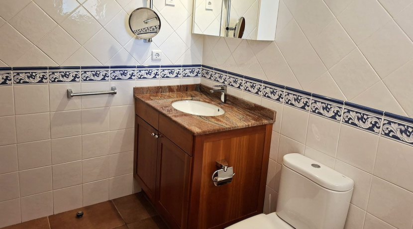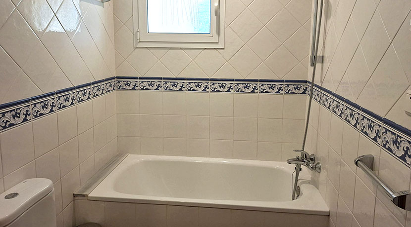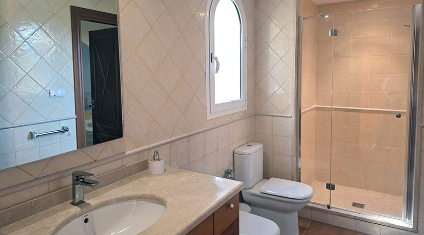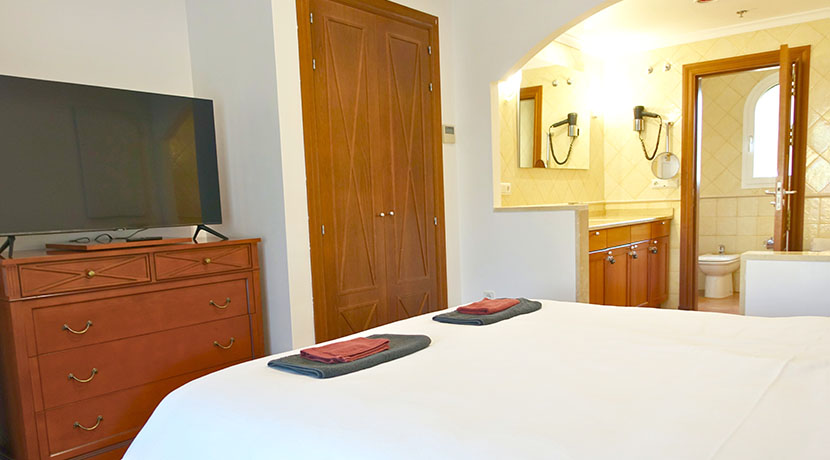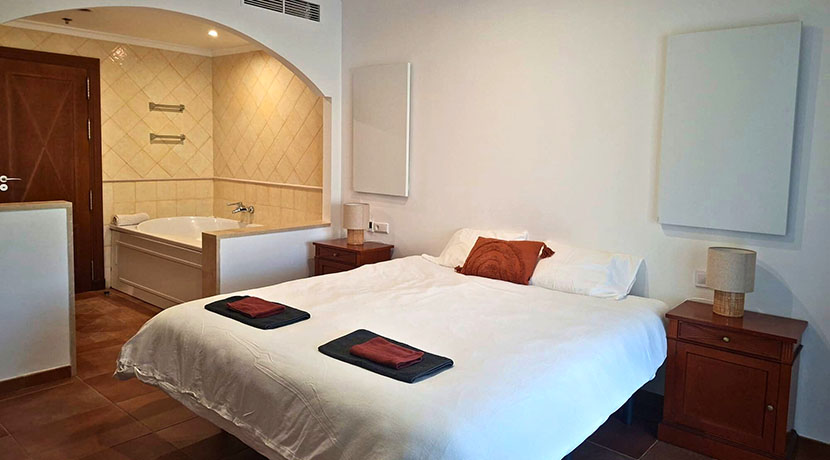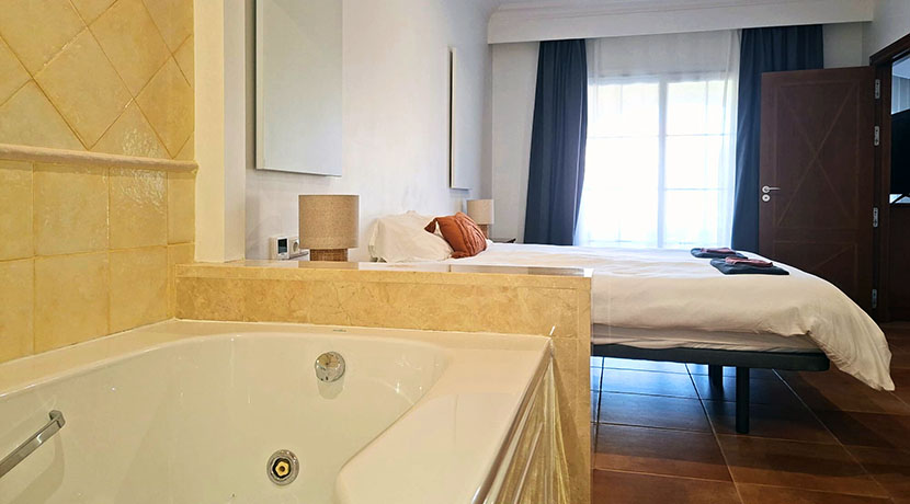 El dormitorio principal, amplio y luminoso, incluye una elegante bañera de hidromasaje junto a un mueble de doble lavabo, en una disposición sutilmente integrada en el ambiente. Desde aquí también se accede a la terraza. Un baño completo con ducha de obra completa esta unidad.