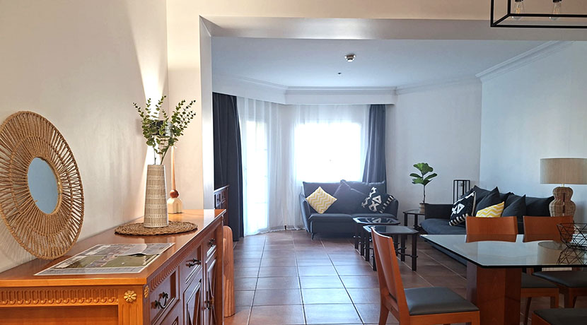 Cuenta con un recibidor equipado con un espacioso armario que alberga el termo, la lavadora y la secadora. El salón-comedor, de concepto abierto, integra una cocina totalmente equipada y se abre a una terraza cubierta con vistas a los exuberantes jardines del residencial.