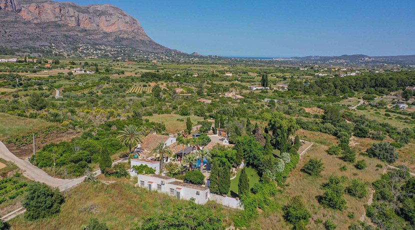 Rodeada de naturaleza y con vistas a la ladera sur del Montgó, la propiedad se encuentra a 1,5 km del pintoresco pueblo de Jesús Pobre y a 4,2 km del campo de golf La Sella. Las ciudades de Dénia y Jávea están ambas a unos 10 km, mientras que las rutas de senderismo del Montgó comienzan a apenas 3 km. La carretera nacional N-332 conectando Valencia y Alicante se encuentra a 1,1 km y la autopista AP7 a 6,5 km.